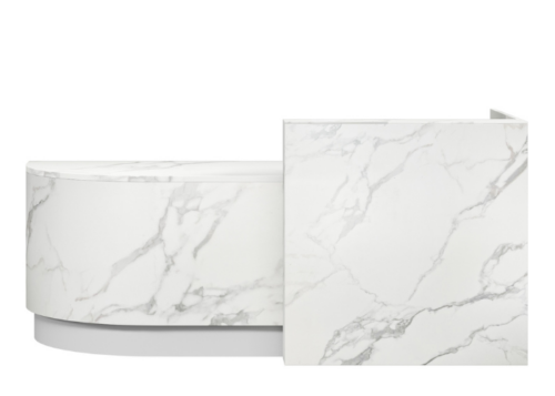 Caringbah Premium Reception Desk is made of marble look elegantly curved panels. Features Curved End Desk with Marble Look Hob